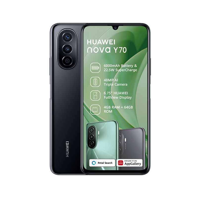 – HUAWEI nova Y70 comes with a triple AI camera setup that’s as adaptable as it is awe-inspiring. A touch of the shutter is all it takes to capture a distant landscape, priceless portrait, or timeless interaction.