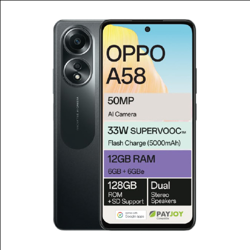The OPPO A58 is a budget-friendly 4G smartphone featuring a 6.72-inch FHD+ display, MediaTek Helio G85 processor, 6GB/8GB RAM, 128GB storage, and a 50MP dual camera. It includes a 5000mAh battery with 33W SUPERVOOC charging, stereo speakers, and runs on Android 13-based ColorOS.