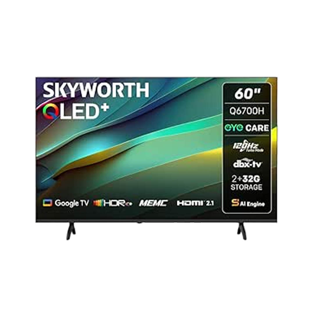 Upgrade your entertainment with the SKYWORTH 60″ Q6700H 4K QLED+ Google TV. Featuring a 4K Ultra HD QLED+ display with 90% DCI-P3 color and 1200:1 contrast, it delivers vibrant colors, sharp detail, and deeper blacks for a premium viewing experience. Enjoy ultra-smooth visuals with 120Hz HSR and MEMC, perfect for sports and gaming. HDR10+, Dolby Vision, and HLG enhance every scene with improved brightness and contrast, while Dolby Atmos and DBX-TV audio provide immersive sound. Powered by Google TV, access thousands of apps including Netflix, YouTube, and Prime Video, control with Google Assistant, and stream easily using Chromecast built-in. With Game Mode, HDMI 2.1, dual-band WiFi, Bluetooth 5.1, and 32GB storage, this TV delivers fast performance and flexible connectivity. Eye Care 5.0 technology ensures comfortable viewing for extended use. The SKYWORTH 60Q6700H combines powerful performance, smart features, and premium picture quality for a complete home entertainment experience.