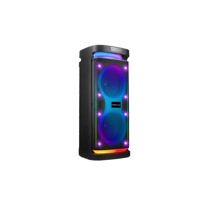 Get the party started with the VolkanoX Titan, a powerful Bluetooth speaker designed to fill any space with booming 100W sound. Featuring dual 10″ bass speakers, it delivers deep, rich beats that keep the energy high. Connect effortlessly via Bluetooth or play your favorite tunes from USB and TF cards. With two karaoke microphone inputs, it’s perfect for sing-alongs and celebrations. Enjoy dazzling music-synced lights that bring your party to life. Finished in sleek black plastic, this speaker combines style with performance for unforgettable gatherings.